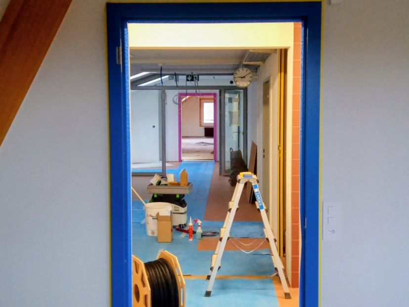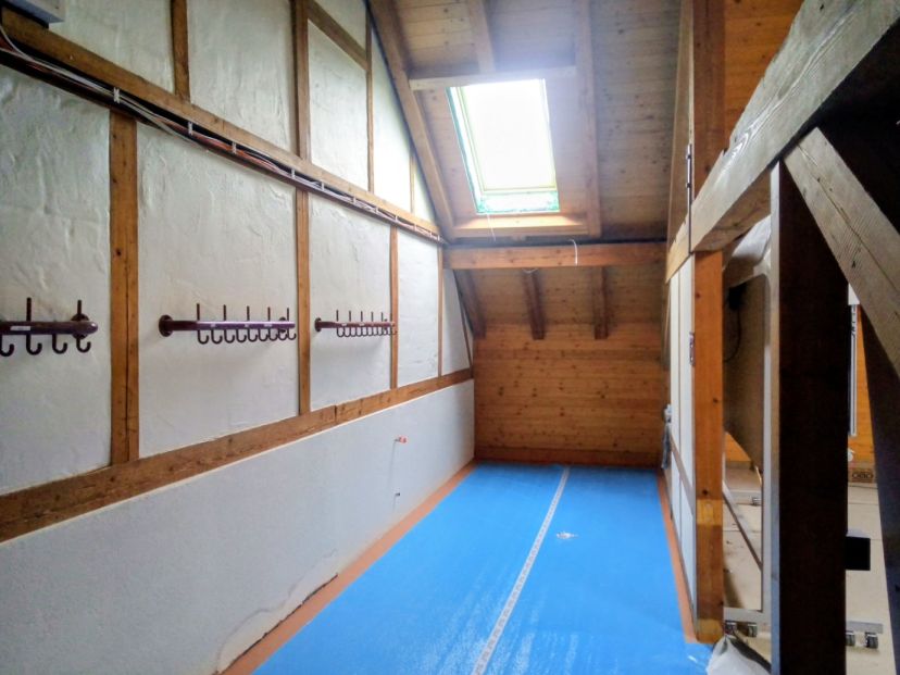 Seit dem Sommer laufen die umfangreichen Sanierungsarbeiten im leeren Schulhaus Bestand; Maler- und Gipserarbeiten, Erneuerung der Sanitär- und Elektroinstallationen, Dachsanierung, Schreinereiarbeiten, etc.