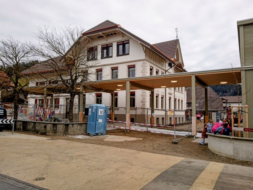 Bis Ende Jahr wird die Sanierung des Schulhauses ebenfalls fertiggestellt sein, so dass sich ab Mitte Dezember die 3. – 6. Klassen wieder im Bestand einrichten und die Oberstufe (bis dahin in Oberhünigen) in den Neubau einziehen können.